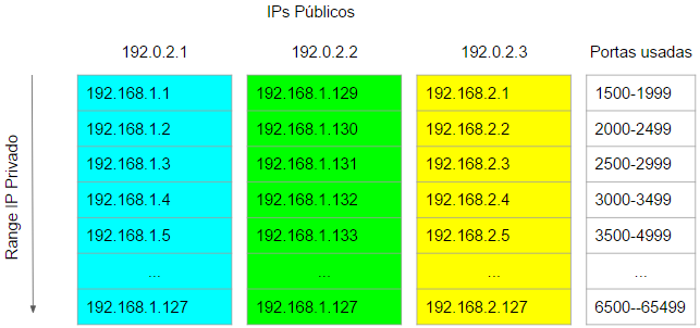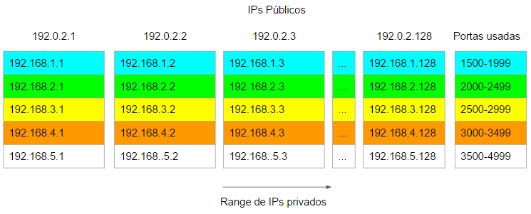 - O Range de IPs Privados ficando dentro de 1 IP público a contagem de portas não se perde. A cada Range de IPs Privado novo uso um novo IP público.